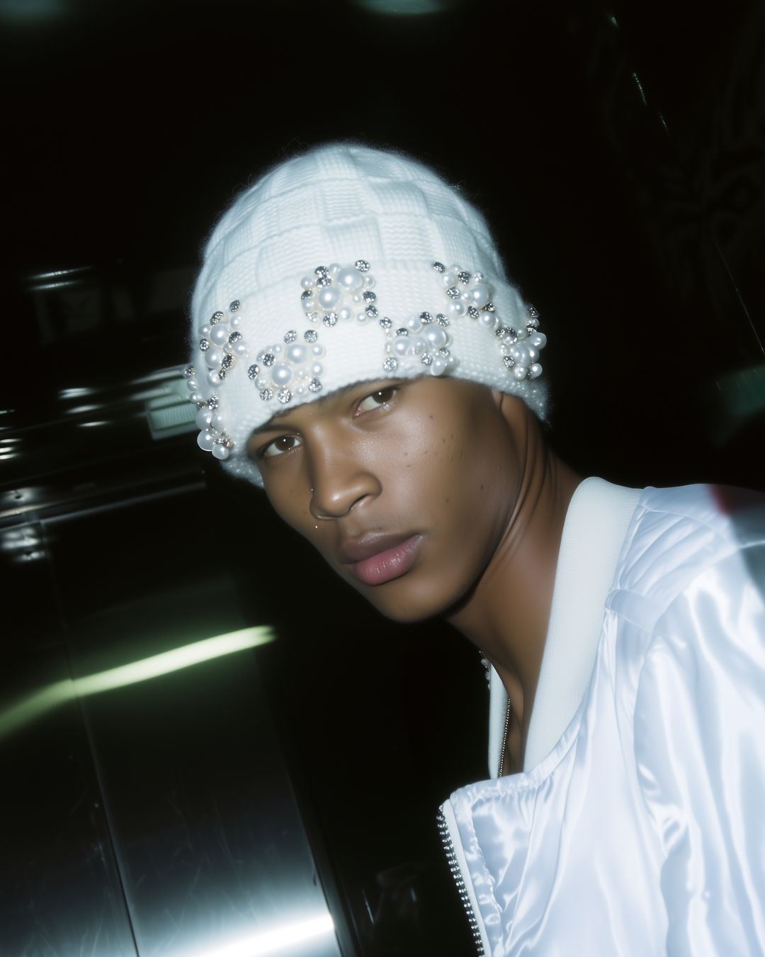 A sumptuous signature accessory, this beanie is lavishly adorned with over 280 hand-stitched pearls and rhinestones, forming a glittering checkerboard motif along the brim.